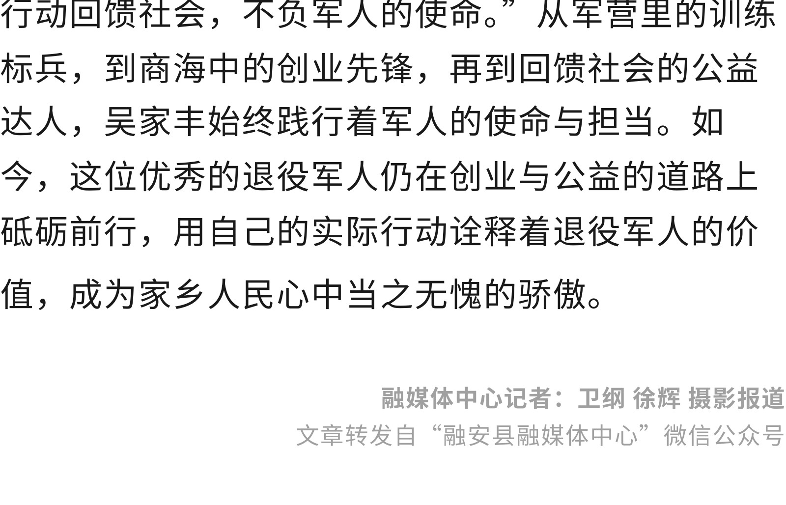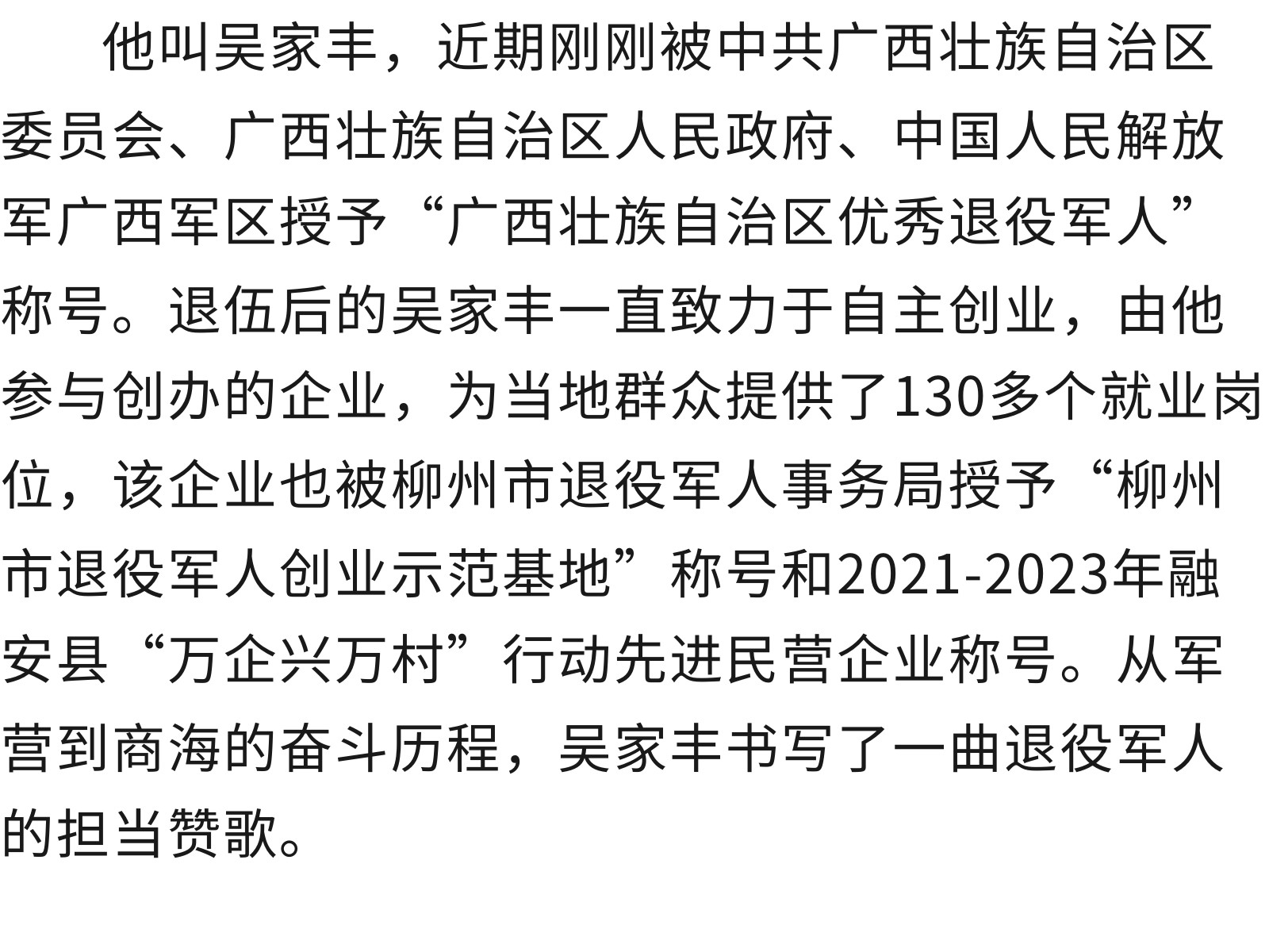 【最美退役軍人】從軍營硬漢到創(chuàng)業(yè)先鋒——記廣西優(yōu)秀退役軍人吳家豐 發(fā)布時間:2025年09月19日 09時來源:本站原創(chuàng)瀏覽:93 人次