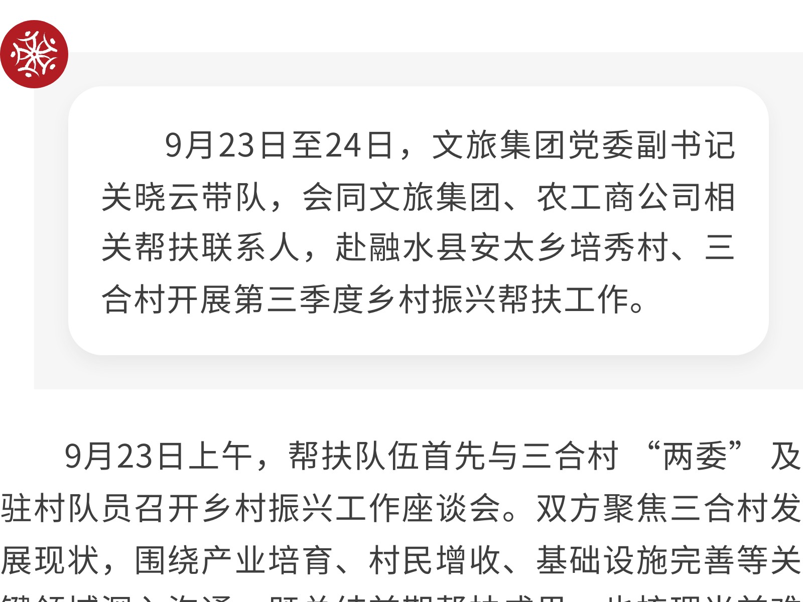 文旅集團開展2025年第三季度鄉(xiāng)村振興幫扶活動 發(fā)布時間:2025年09月30日 16時來源:本站原創(chuàng)瀏覽:139 人次