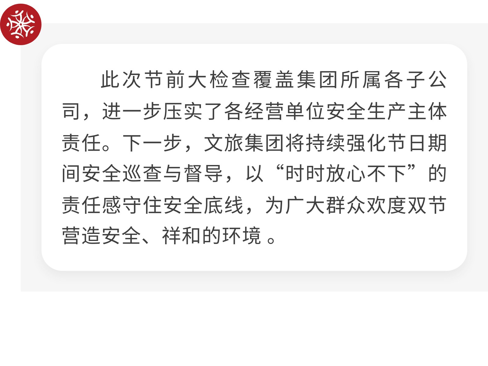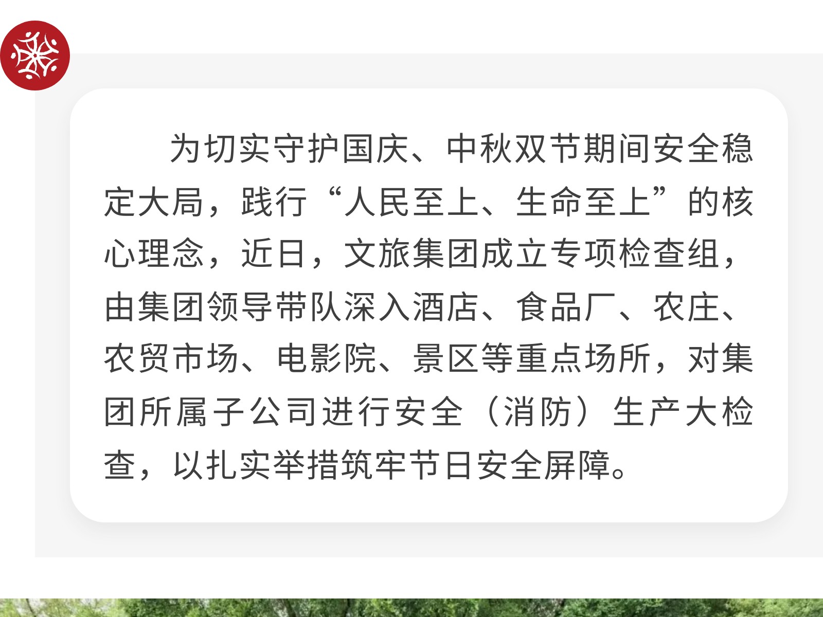 【筑牢安全防線 護航雙節(jié)安寧】文旅集團開展節(jié)前安全(消防)生產(chǎn)大檢查 發(fā)布時間:2025年09月30日 17時來源:本站原創(chuàng)瀏覽:139 人次