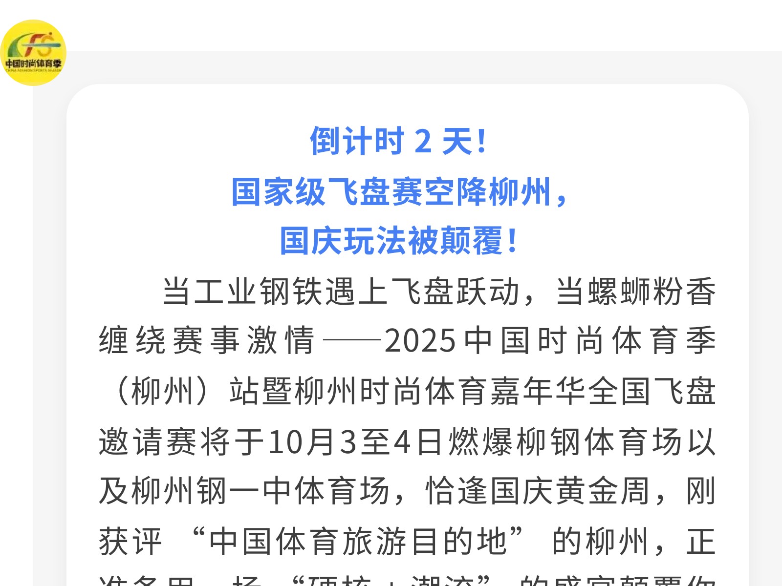國(guó)慶赴柳!鋼鐵賽場(chǎng)飛盤燃,柳州這座體育旅游之城藏不住了 發(fā)布時(shí)間:2025年10月02日 17時(shí)來源:本站原創(chuàng)瀏覽:49 人次