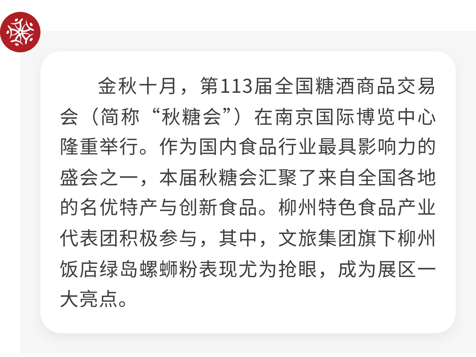 【一碗螺螄粉,香動(dòng)秋糖會(huì)】文旅集團(tuán)柳州飯店綠島螺螄粉用實(shí)力“圈粉” 發(fā)布時(shí)間:2025年10月22日 10時(shí)來(lái)源:本站原創(chuàng)瀏覽:33 人次