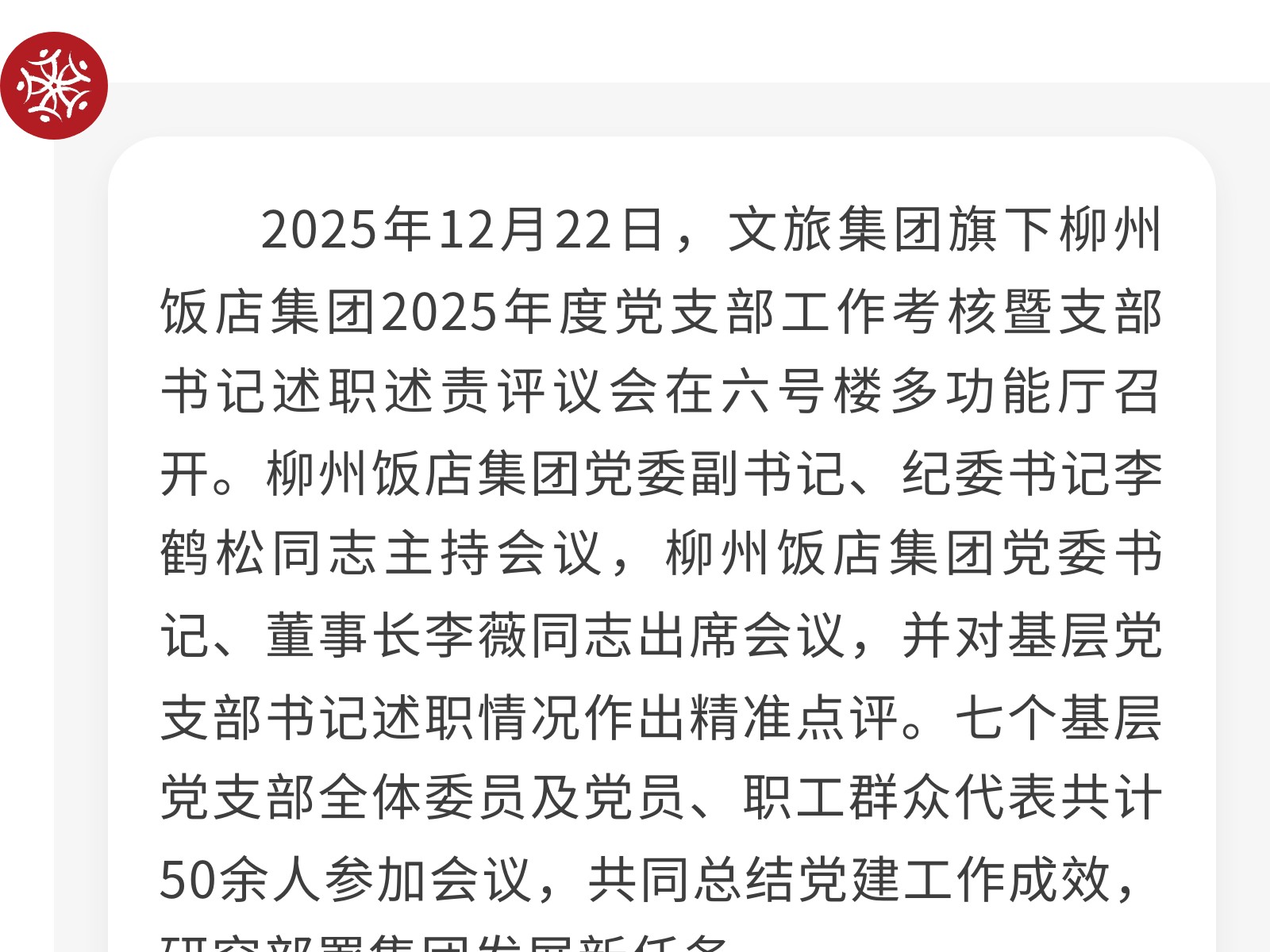 黨建引領(lǐng)聚合力 砥礪奮進譜新篇——柳州飯店集團2025年度黨支部工作考核暨支部書記述職述責評議會圓滿召開 發(fā)布時間:2025年12月30日 11時來源:本站原創(chuàng)瀏覽:3 人次