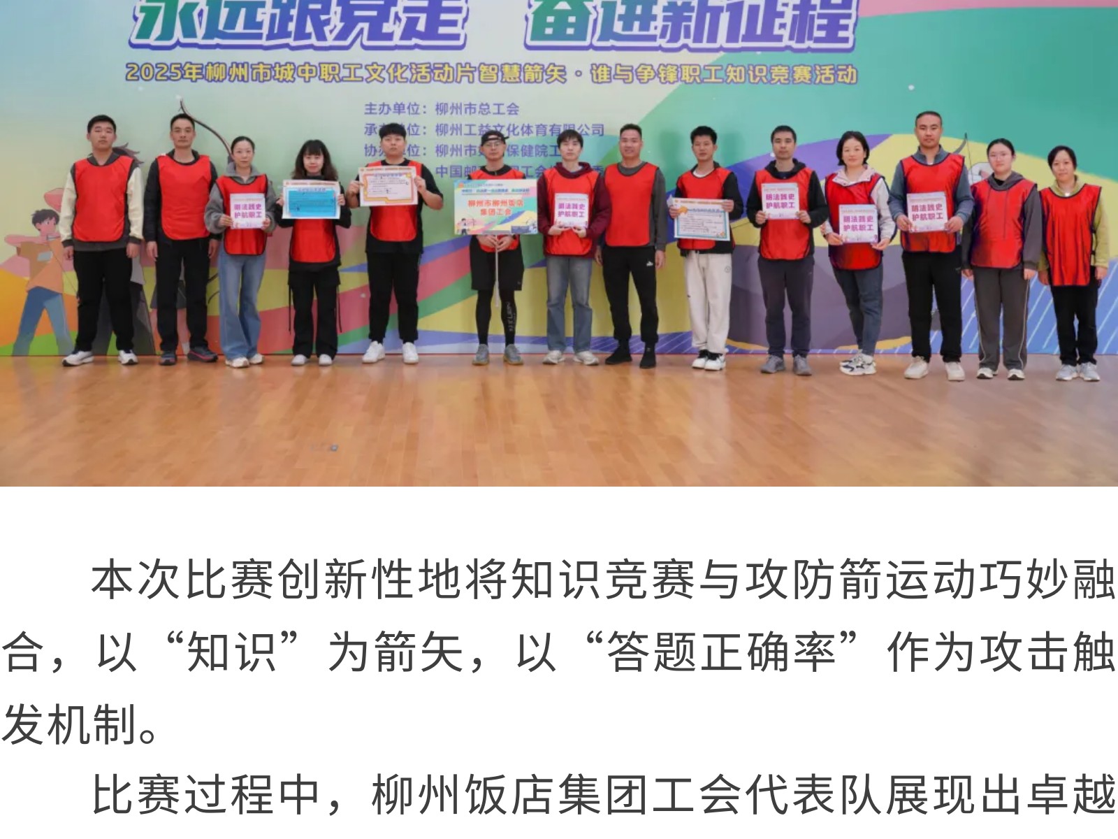 智慧箭矢,誰(shuí)與爭(zhēng)鋒!——柳州飯店集團(tuán)工會(huì)戰(zhàn)隊(duì)閃耀城中職工文化活動(dòng)賽場(chǎng) 發(fā)布時(shí)間:2025年12月30日 11時(shí)來(lái)源:本站原創(chuàng)瀏覽:3 人次